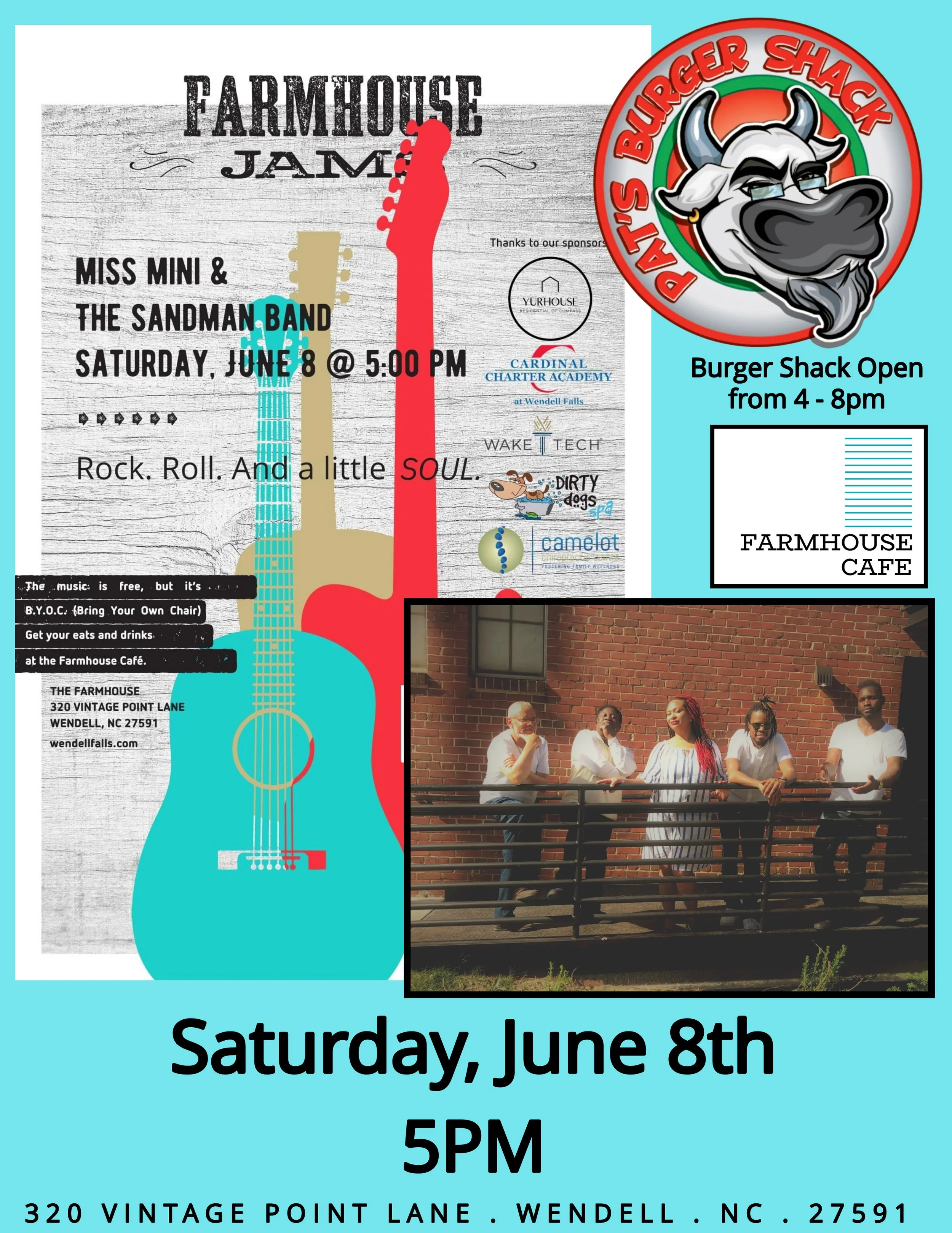 Join us at the Farmhouse Cafe on June 8th for Farmhouse Jams. Live music by Mini & The Sandman Band will go from 5 to 8pm. Pat’s Burger Shack will be set up and ready to feed you at 4pm until 8pm. Live music plays down the hill at the pavilion. Bring a chair or blanket to enjoy the show!